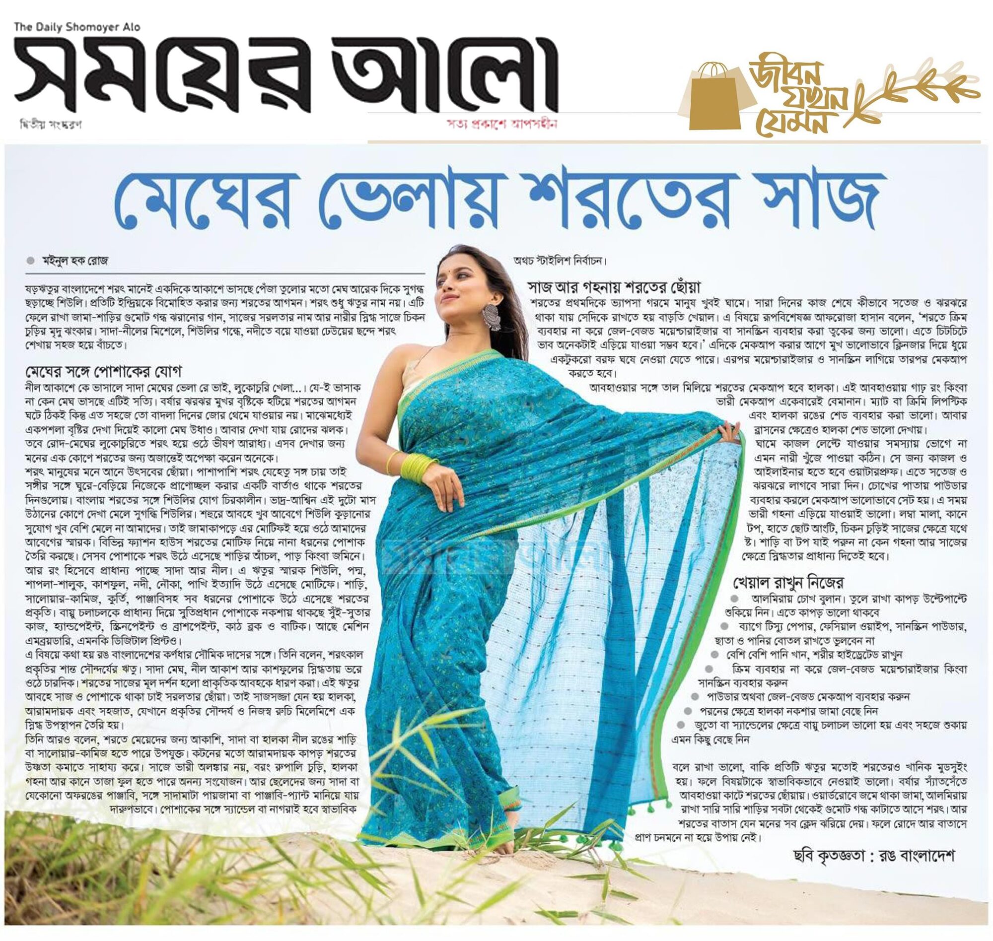 ষড়ঋতুর বাংলাদেশে শরৎ মানেই একদিকে আকাশে ভাসছে পেঁজা তুলোর মতো মেঘ আরেক দিকে সুগন্ধ ছড়াচ্ছে শিউলি। প্রতিটি ইন্দ্রিয়কে বিমোহিত করার জন্য শরতের আগমন। শরৎ শুধু ঋতুর নাম নয়। এটি ফেলে রাখা জামা-শাড়ির গুমোট গন্ধ ঝরানোর গান, সাজের সরলতার নাম আর নারীর স্নিগ্ধ সাজে চিকন চুড়ির মৃদু ঝংকার। সাদা-নীলের মিশেলে, শিউলির গন্ধে, নদীতে বয়ে যাওয়া ঢেউয়ের ছন্দে শরৎ শেখায় সহজ হয়ে বাঁচতে।