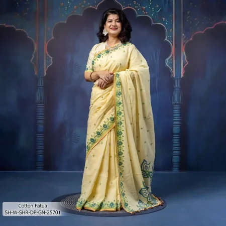 - Product Details: This Sulb-Cotton sharee feature Screen-Print , Patch-Work & Hand-Work .