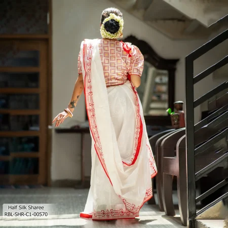 - Product Details: This half-silk sharee features screen-print & handwork.
