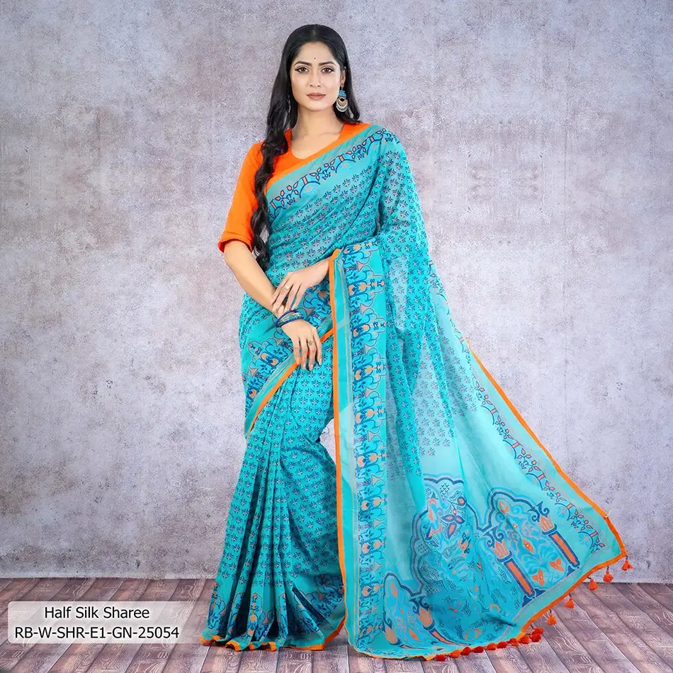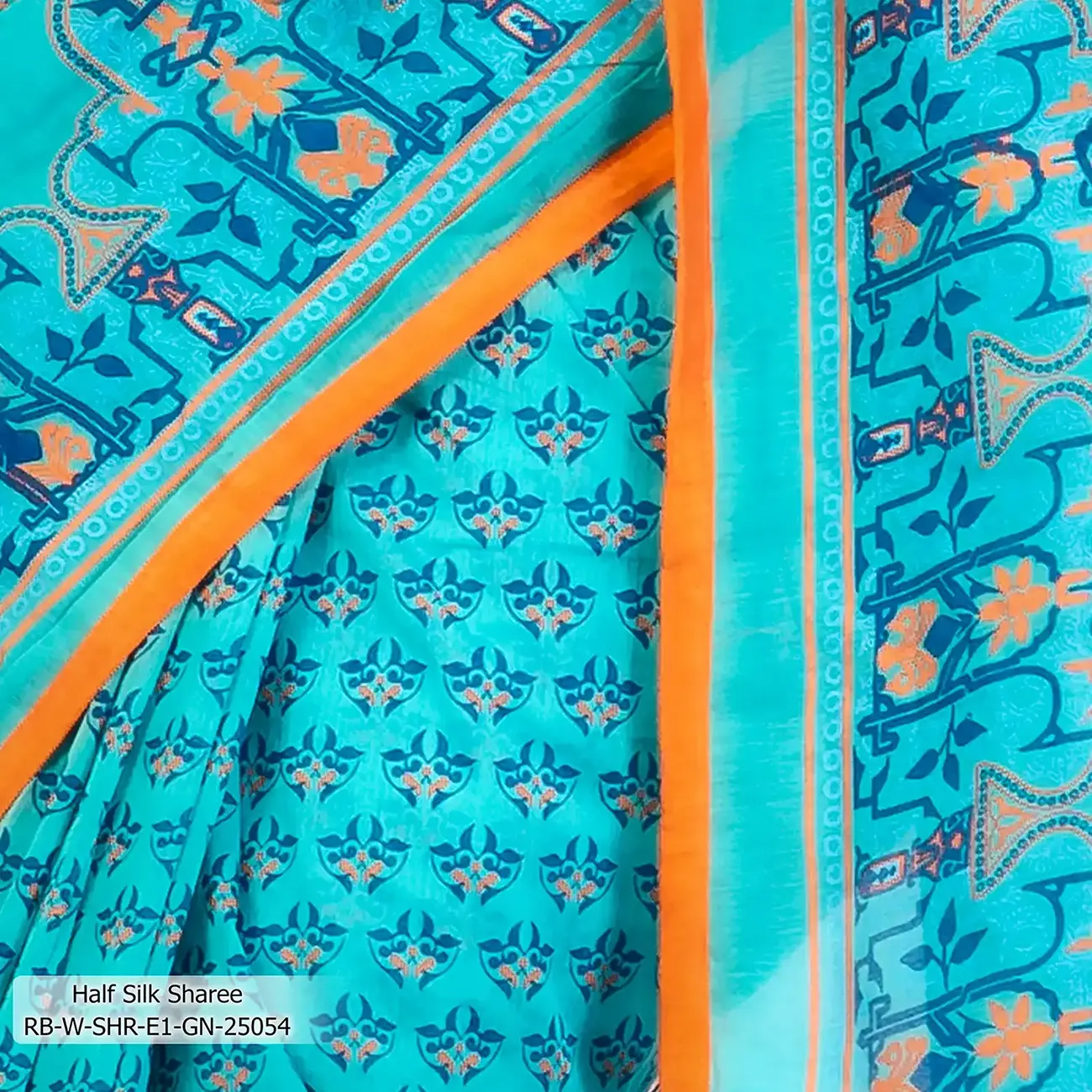 • Product Details: This Half-Silk sharee features screen-print, handwork .