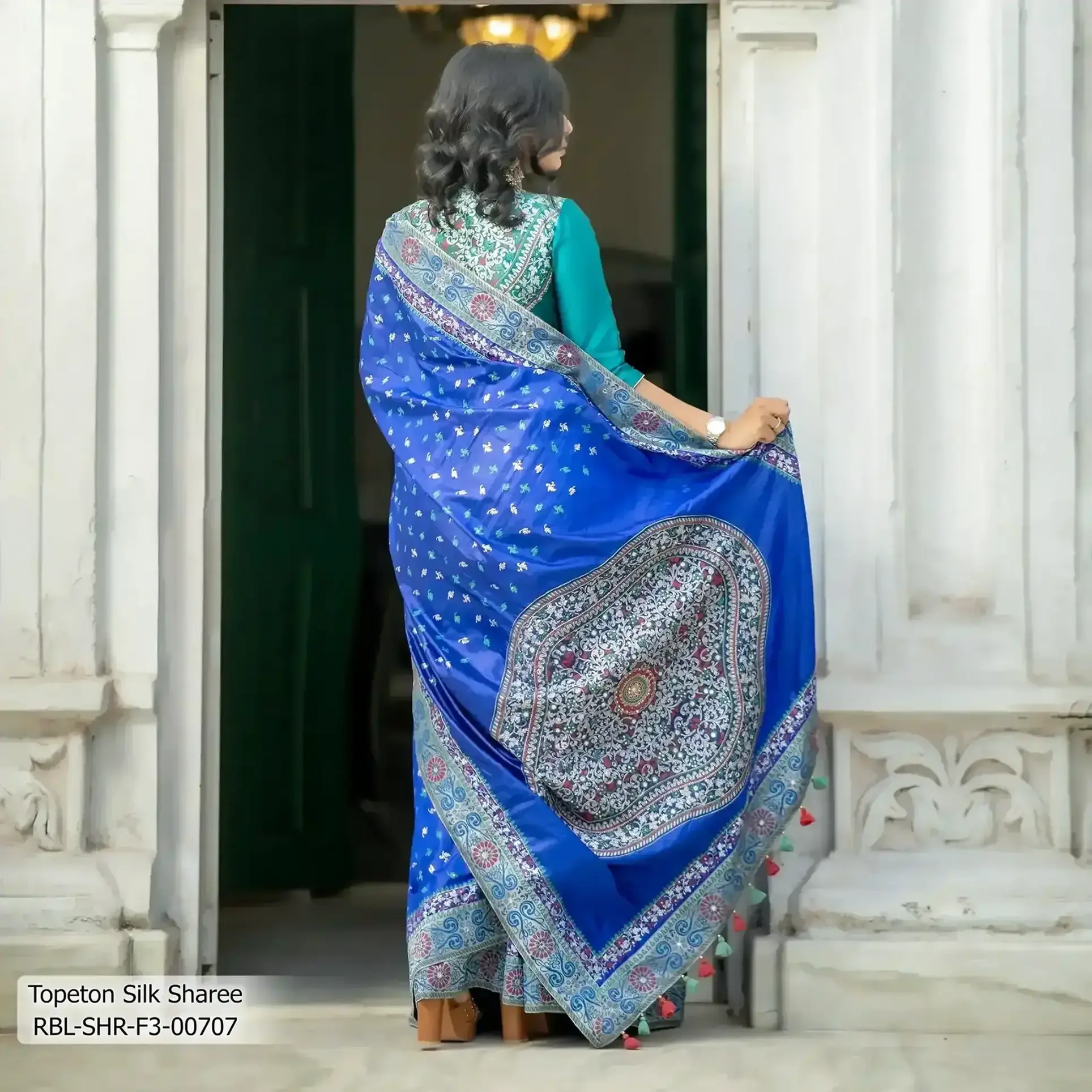 - Product Details: This Topeton-silk women’s sharee features Screen-Print, Hand-Work Karchupi & Patch-Work(With Blouse).
