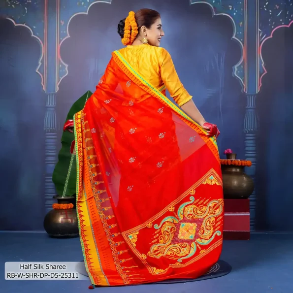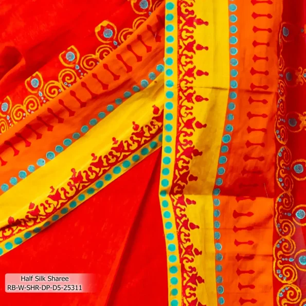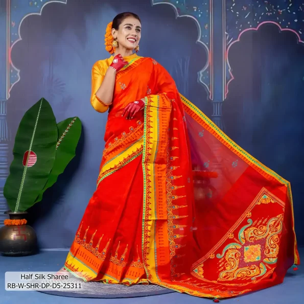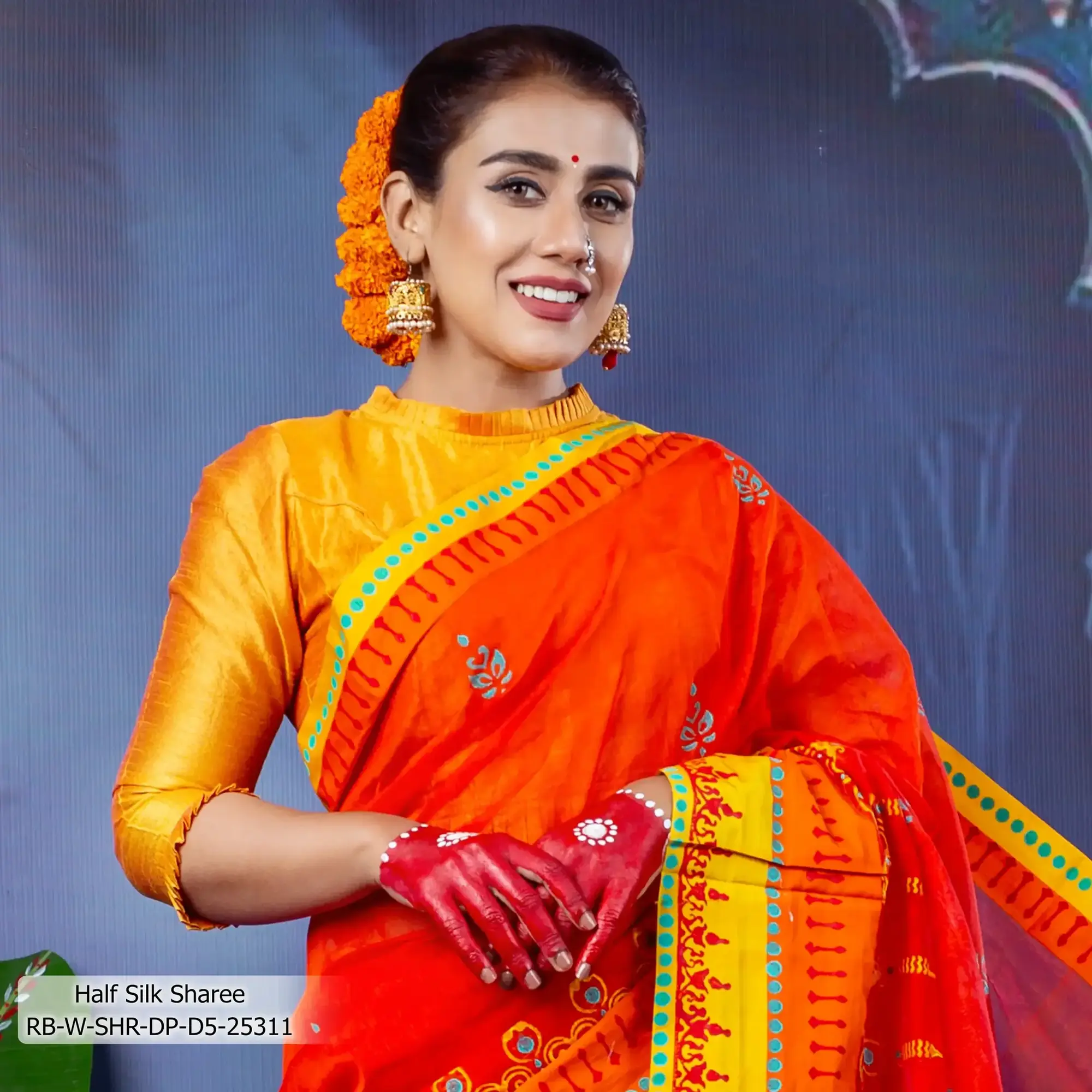- Product Details: This half-Silk sharee features Screen-print & Hand-work.