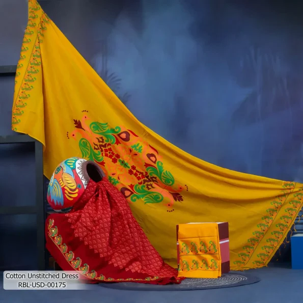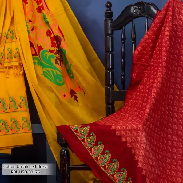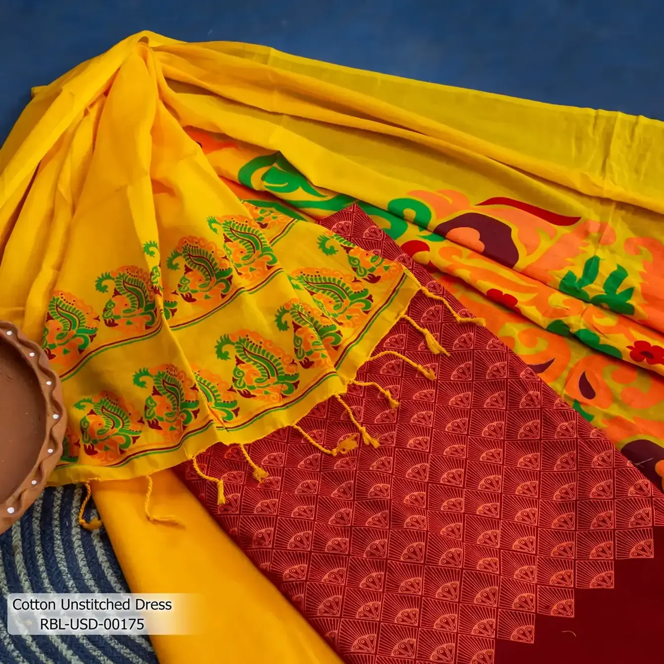 - Product Details: This Cotton women’s unstitched dress features screen-print & handwork.